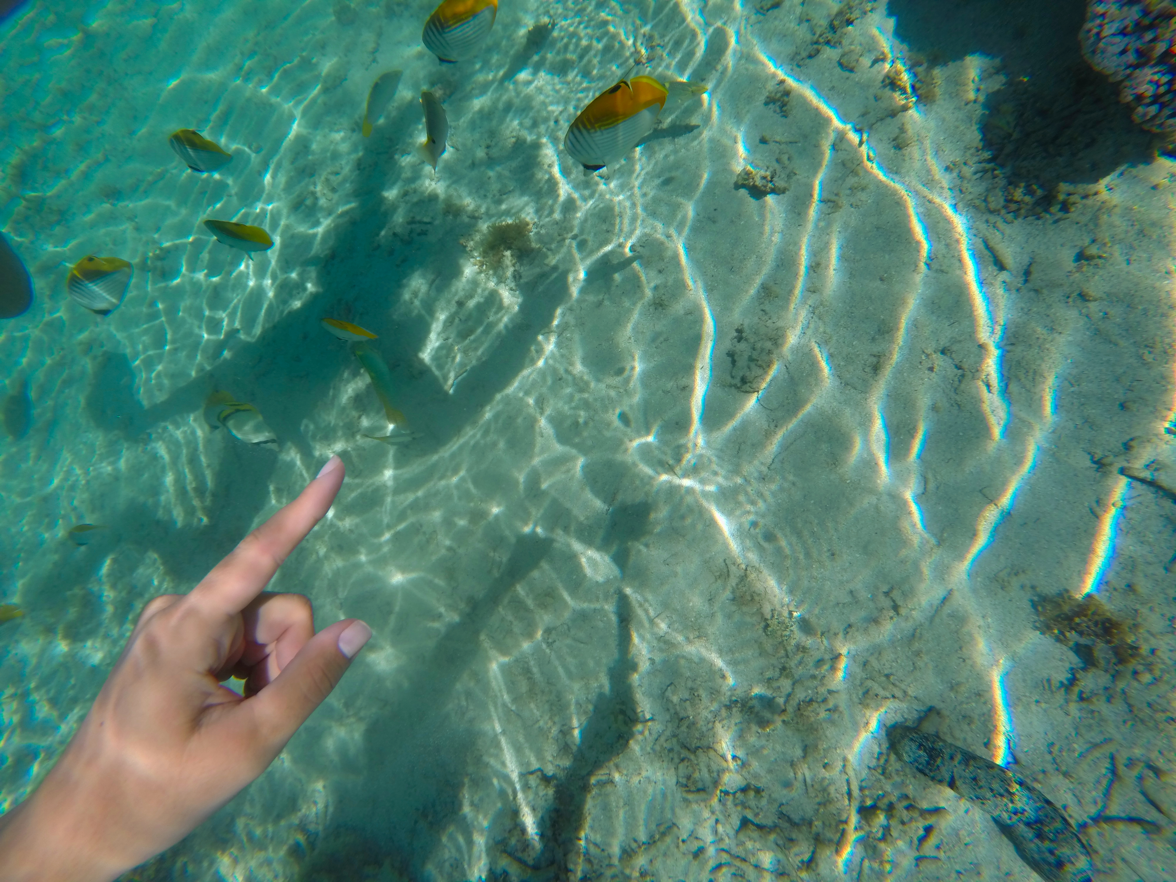 17.11, quarto e último dia em Moorea: como era o nosso último dia por lá, optamos por ter o dia livre, então, tomamos café da manhã e praticamos snorkeling na lagoa durante toda a manhã. A vida marinha que se encontra no resort é um espetáculo à parte. Almoçamos, arrumamos as malas e partimos para o aeroporto para embarcarmos para a tão sonhada ilha de Bora Bora. Antes de irmos embora, fomos presenteados com colares de conchas do mar como lembranças.