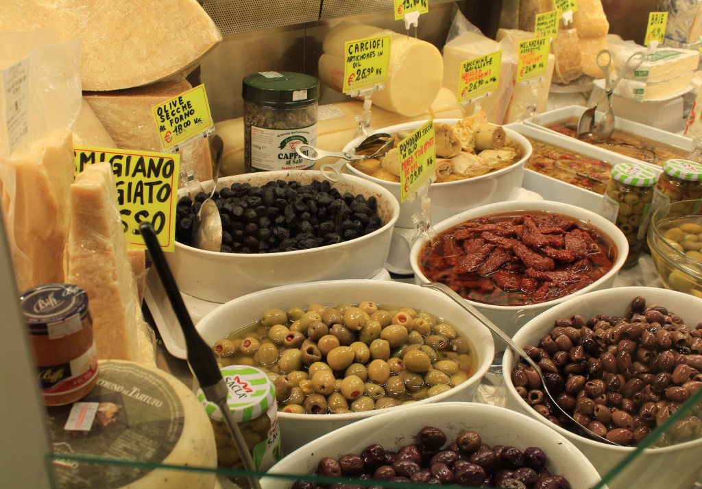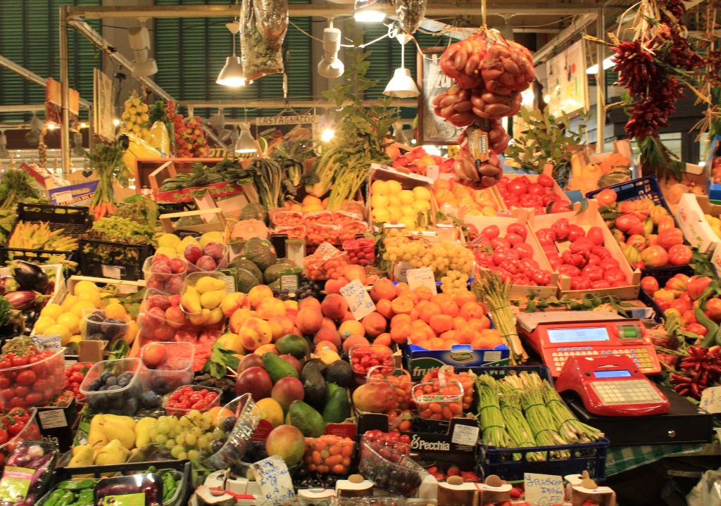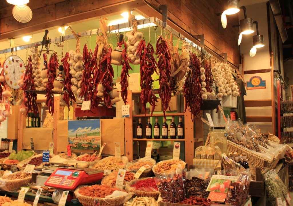 No mercado central de Florença, o visitante encontra muitos dos produtos da região expostos em barracas e tem a oportunidade de comer no local ou comprar os produtos de sua escolha e levar para casa.
