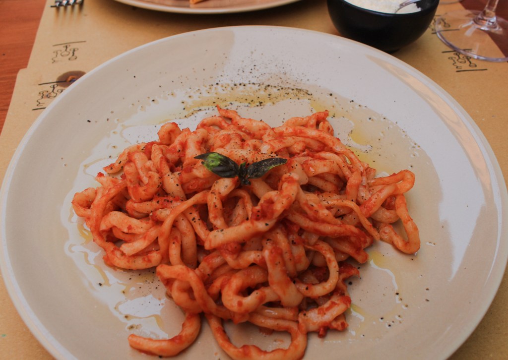 Caminhamos pelas ruas da cidade e almoçamos na Trattoria Fonte Giusta para encerrar nossa visita ali.