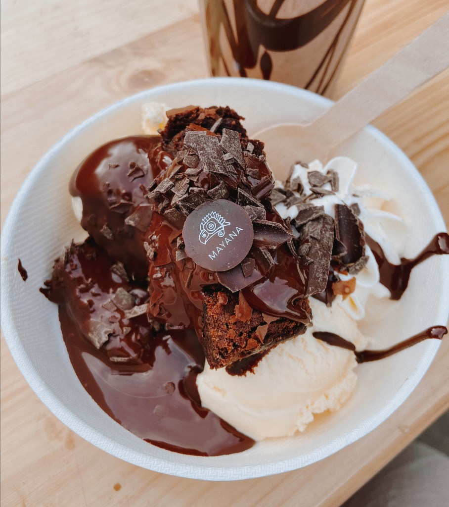 Experimentamos pratos dos seguintes estabelecimentos: Spit House (lanche com frango assado, alface, bacon, maçã e molho de pimenta preta); Sumatra Food (noodles com vegetais); Cambodian Wok (frango ao curry, arroz, macarrão, legumes e molho); Komparto (sashimi de salmão, arroz de sushi, molho, salada de algas marinhas e soja); uma sobremesa e milkshake do Chocoladebar Mayana (amo!).