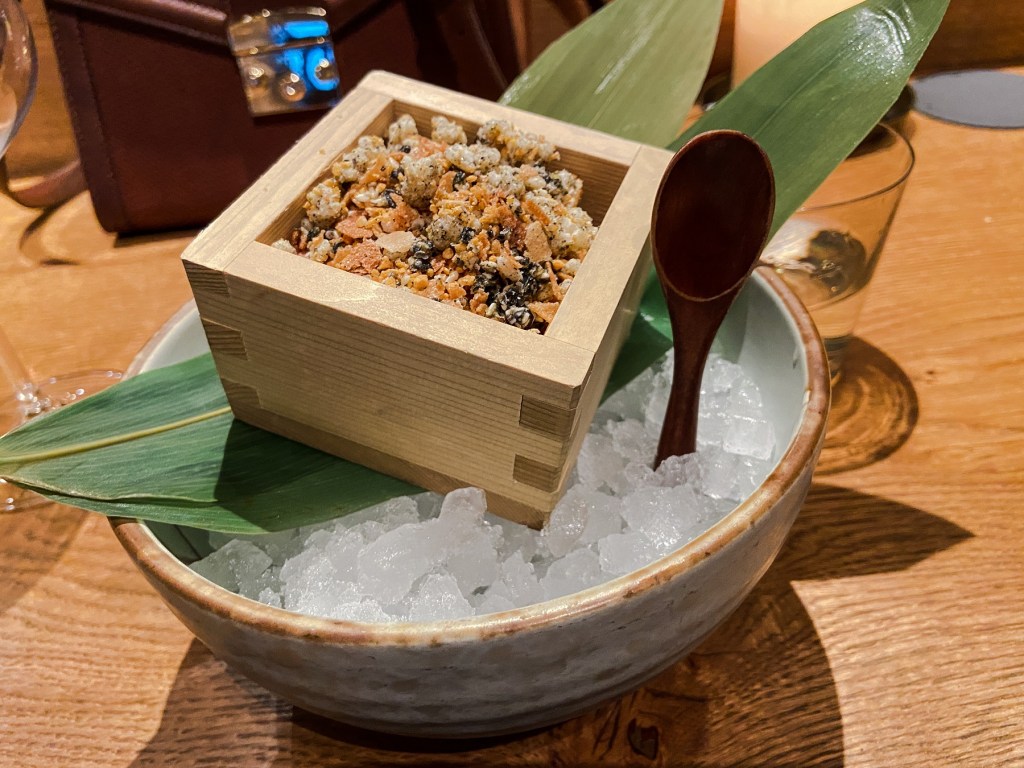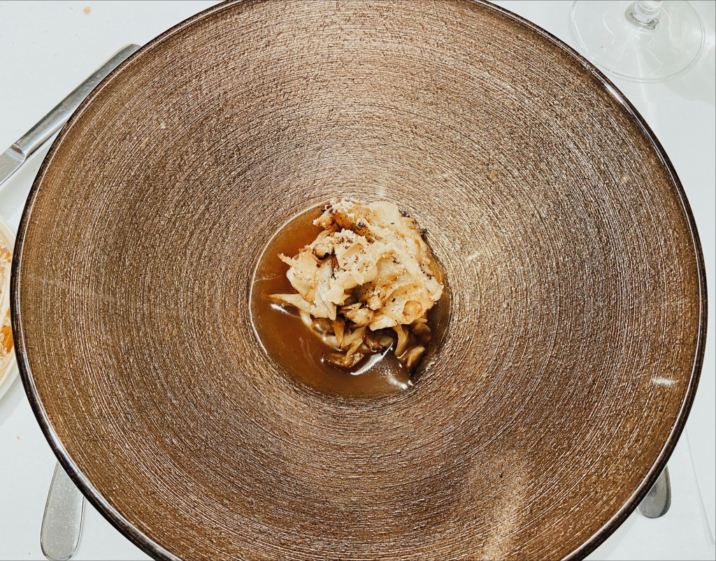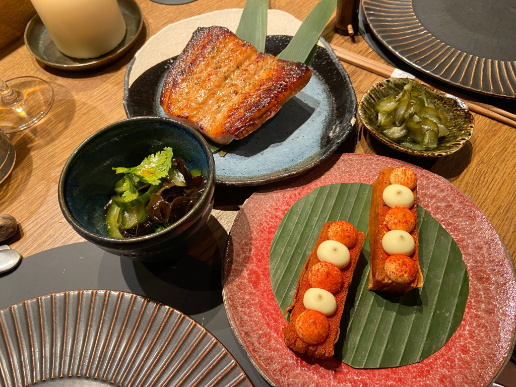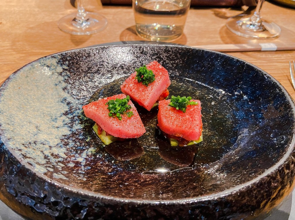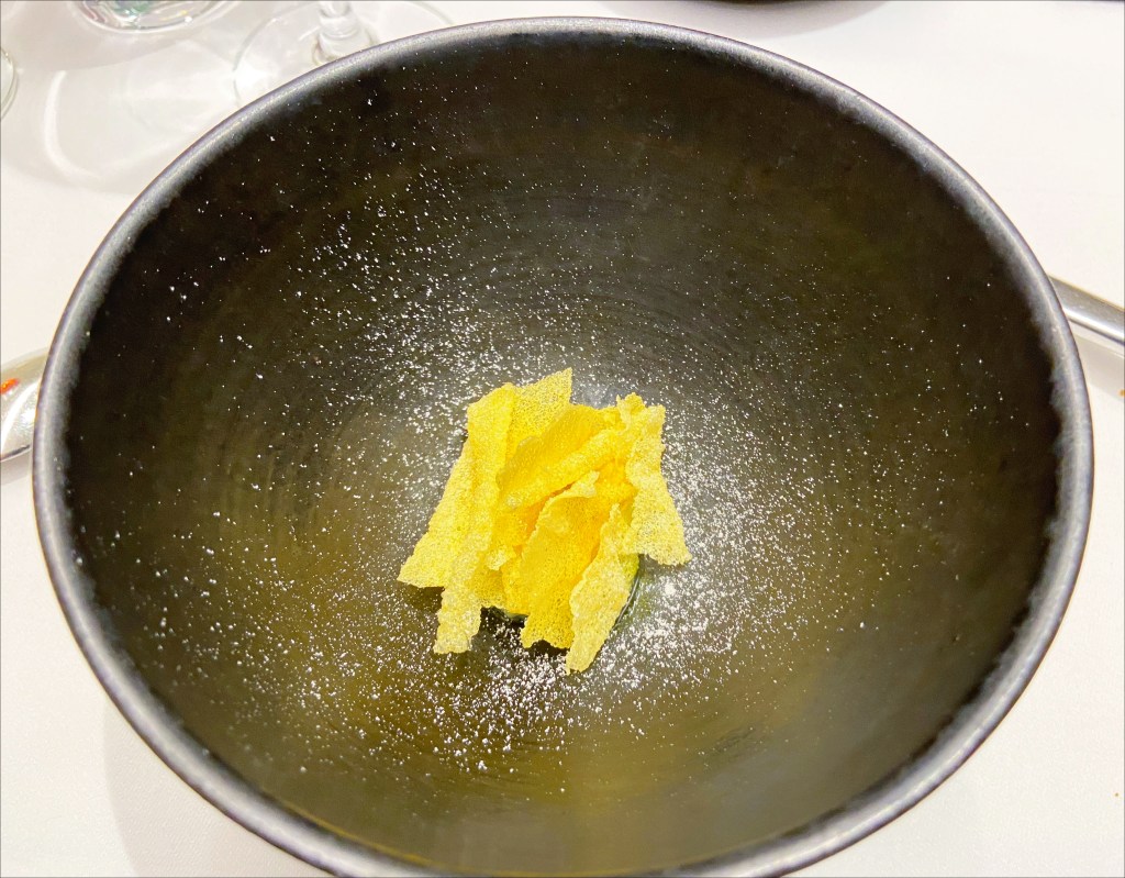 O menu começou a ser servido… nós optamos pelo menu com 7 pratos. Para mim, alguns dos pratos que foram servidos e que algumas das imagens demonstram, eram diferentes da descrição, pois eu não como todos os tipos de carne, apenas peixes e frutos do mar.