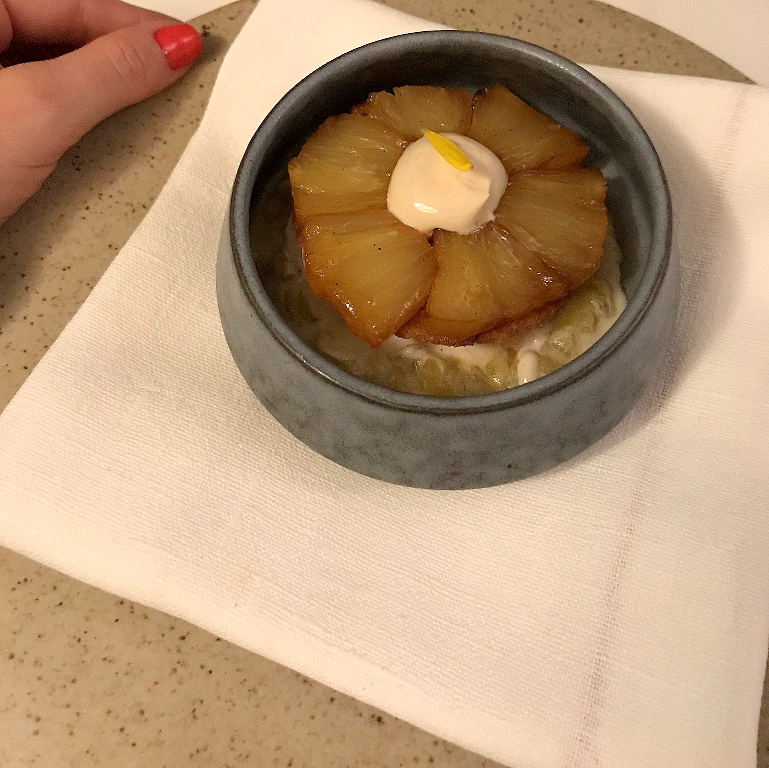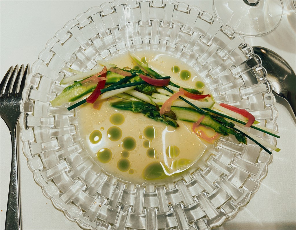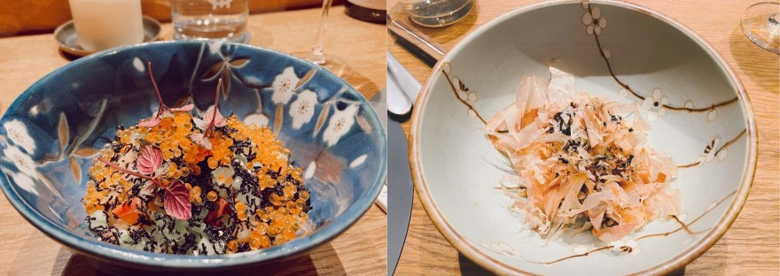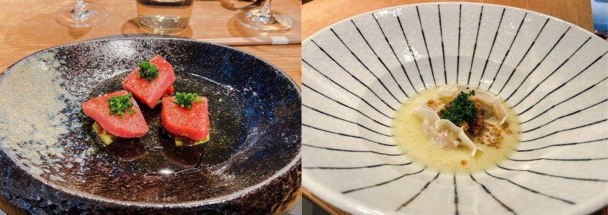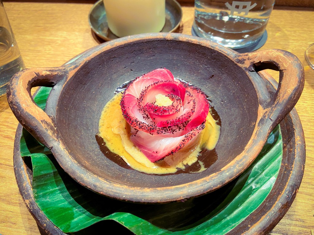 O menu começou a ser servido… nós optamos pelo menu com 7 pratos. Para mim, alguns dos pratos que foram servidos e que algumas das imagens demonstram, eram diferentes da descrição, pois eu não como todos os tipos de carne, apenas peixes e frutos do mar.