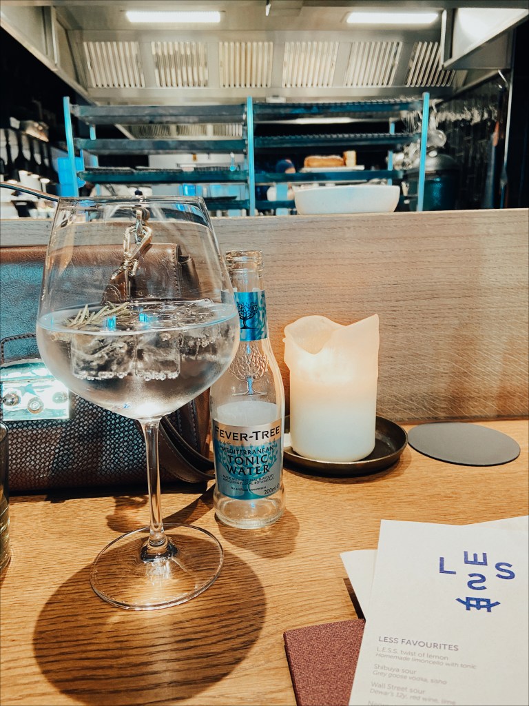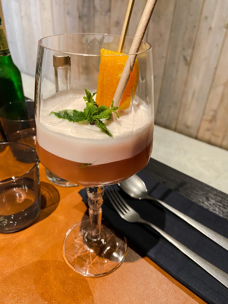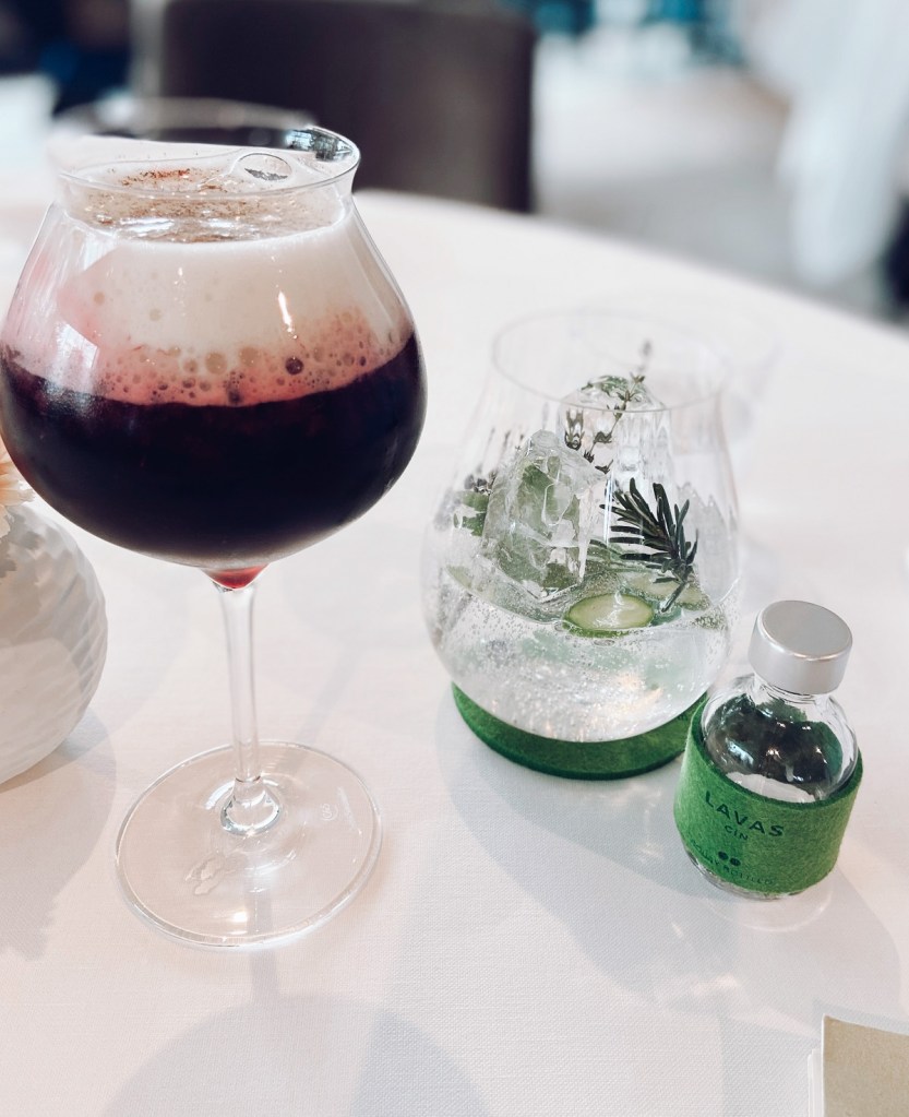 Ao chegarmos, fomos gentilmente recebidos e acomodados no salão com vista para o jardim. Foi perguntado o que gostaríamos de beber como aperitivo enquanto aguardaríamos as entradas de cortesia (starters) chegarem. Como eu estava grávida, aceitei a sugestão de um mocktail (que, infelizmente, não me agradou tanto por causa da intensidade de cereja). Meu marido pediu G&T.