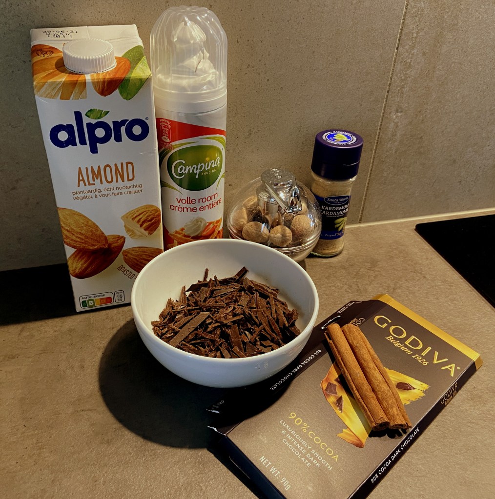 Coloque o leite de amêndoas na panela e ligue o fogão em baixa temperatura. Acrescente os dois pedaços de canela, um pouco de cardamomo e noz moscada moída. Espere o leite de amêndoas aquecer (não precisa deixar ferver para a receita) e acrescente o chocolate (raspas). Mexa (eu começo usando o fouet e depois mantenho com espátula de silicone para não grudar na panela). Espere até formar a textura que deseja (eu deixo um pouco mais de vinte minutos e fica bem cremoso).