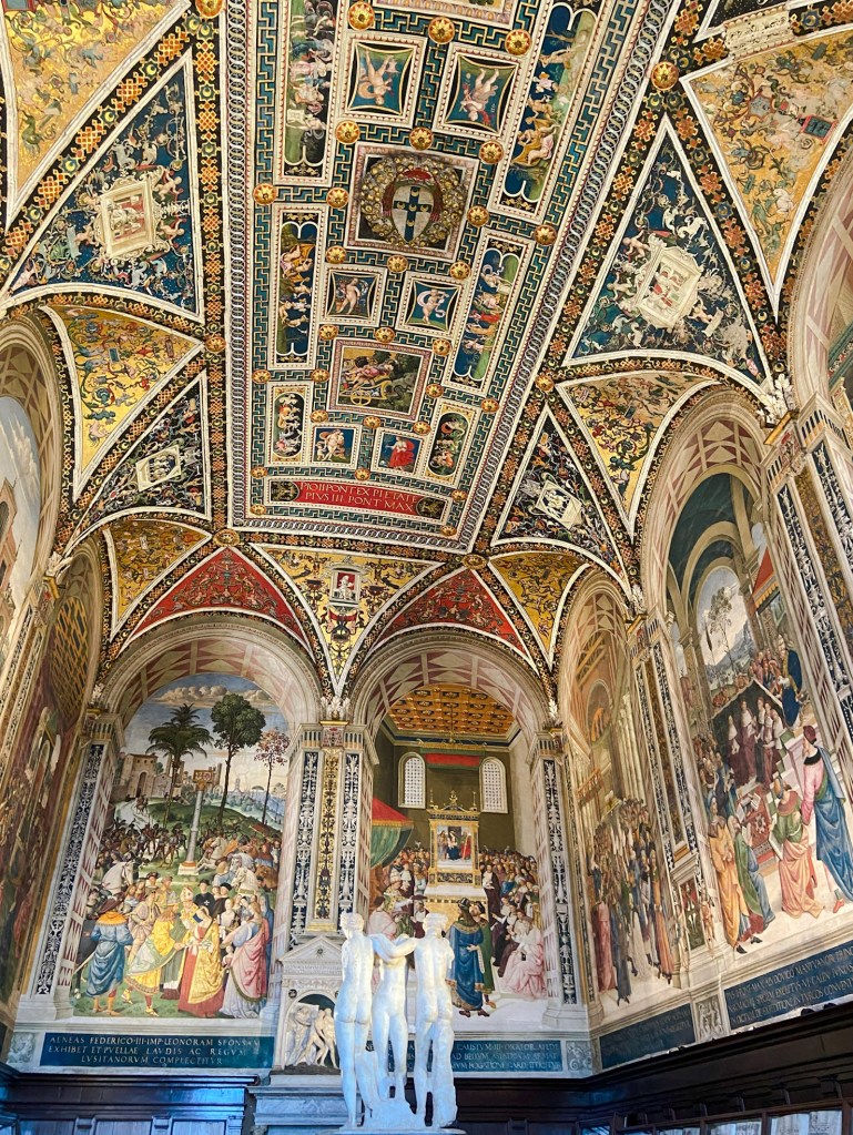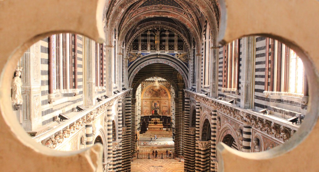 Participamos de uma visita com guia, que explicou a história da catedral e nos levou a lugares onde o acesso só é permitido com guia. Eu achei o interior da catedral de Siena muito mais interessante se comparada com a catedral de Florença. E a fachada dela também é belíssima! No chão de mármore está uma das obras-primas que podem ser encontradas na catedral.