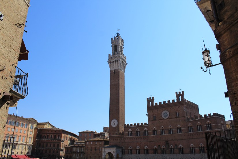 De lá, seguimos até a Piazza del Campo, um dos pontos mais populares da cidade. Lá está a Torre del Mangia com um pouco mais de cem metros de altura e o Palazzo Pubblico (que abriga o Museu Cívico com exposições de obras-primas dos artistas da região), além de restaurantes/cafés.